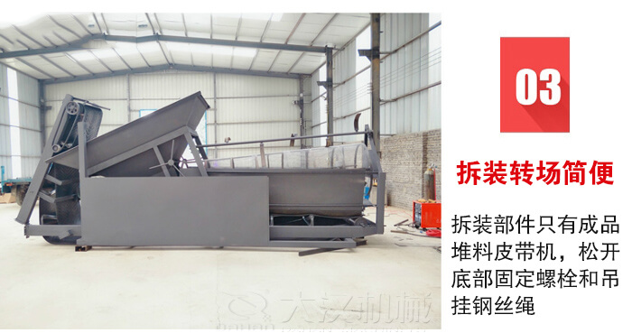設備的高度整體性便于施工現場存放或轉場運輸,拆裝部件只有成品堆料皮帶機,松開底部固定螺栓和吊掛鋼絲繩,將成品皮帶機塞入主框架底面即可。