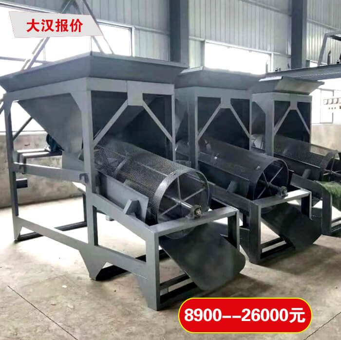 物料從料斗進入滾篩中,經過篩網網孔大小的篩選以及電機帶動軸承于篩網的滾筒,能夠保證物料在篩網中做360°全方位的篩選,同時經過篩網選出的物料就會,經皮帶輸送機,輸送到固定的沙堆或者直接裝車運走,沒有篩出的物料就會隨篩筒滾動到篩尾,從廢料口流出。